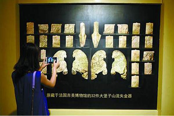 Un visitante toma una foto de los ornamentos de oro que los coleccionistas franceses entregaron a China, el 20 de julio de 2015. [Foto / Xinhua]