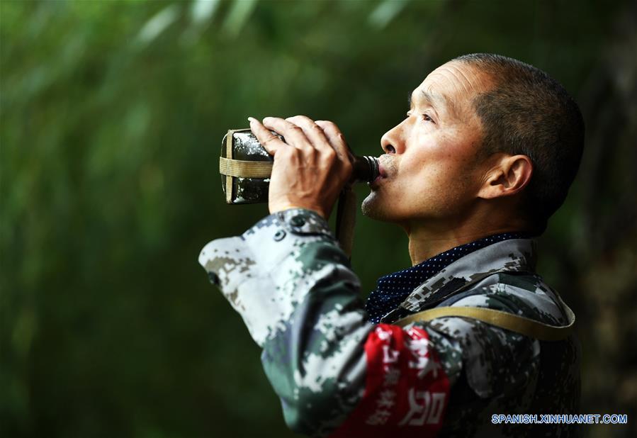 Imagen del 4 de mayo de 2018 de Bin Yuanpeng bebiendo agua durante su patrullaje en la Reserva Natural Nacional Yintiaoling, en el condado de Wuxi de la municipalidad de Chongqing, en el suroeste de China. Bin Yuanpeng, un guardabosques de 59 a?os de edad, ha trabajado en la granja forestal Baiguo de la Reserva Natural Nacional Yintiaoling durante 26 a?os. El trabajo principal de Bin es patrullar y promover el conocimiento de la protección del bosque para evitar algunas actividades ilegales y prevenir desastres naturales. Junto con sus compa?eros de trabajo, Bin siempre patrulla el bosque desde temprano en la ma?ana hasta el anochecer. Debido a sus enfuerzos constantes, el sistema de ecología del bosque ha sido en cierta medida obviamente importado. (Xinhua/Wang Quanchao)