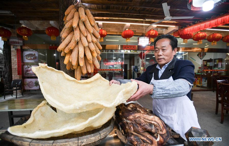 Foto tomada el 12 de mayo del 2018 que muestra al aldeano Yang Yungang trabajando en su restaurante en el municipio Yingxiu del condado Wenchuan, en la provincia de Sichuan. El 12 de mayo del 2008, un terremoto de magnitud 8,0 sacudió Wenchuan, epicentro del lamentable siniestro, destruyendo el condado. Tras diez a?os de esfuerzos, Wenchuan vuelve a la vida. (Foto: Xinhua/Xue Yubin)