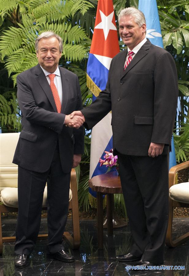 HABANA, mayo 7, 2018 (Xinhua) -- El presidente cubano, Miguel Díaz Canel (d), estrecha la mano con el secretario general de la Organización de las Naciones Unidas (ONU), António Guterres (i), en el Palacio de la Revolución, en La Habana, Cuba, el 7 de mayo de 2018. El secretario general de la Organización de las Naciones Unidas (ONU), António Guterres, llegó el lunes a Cuba en visita oficial, durante la cual asistirá a la apertura del 37 período de sesiones de la Comisión Económica para América Latina y el Caribe (CEPAL), que se realizará ma?ana martes en La Habana. (Xinhua/Desmond Boylan/POOL)