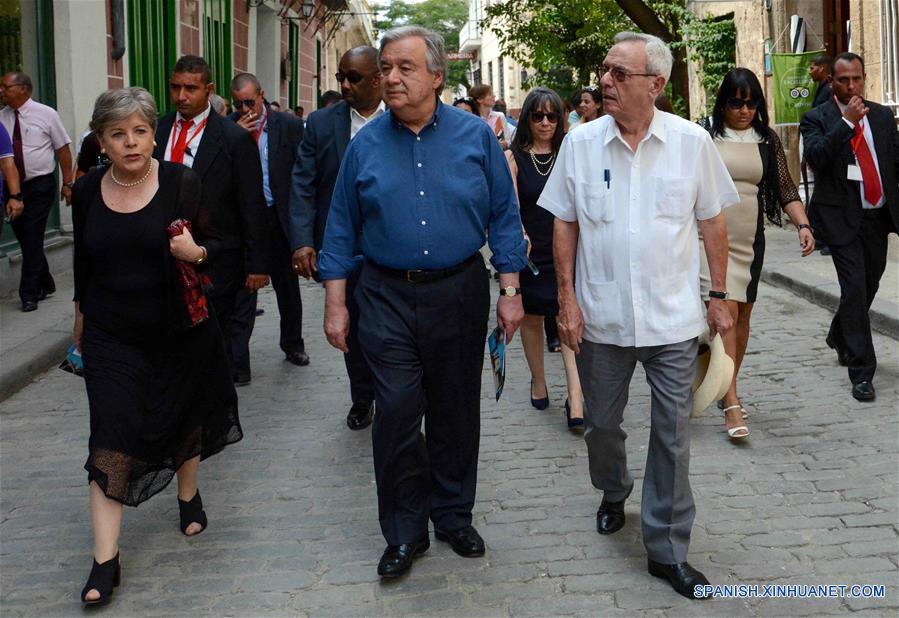 HABANA, mayo 7, 2018 (Xinhua) -- El secretario general de la Organización de las Naciones Unidas (ONU), António Guterres (c-frente), camina por una calle de La Habana, Cuba, el 7 de mayo de 2018. El secretario general de la Organización de las Naciones Unidas (ONU), António Guterres, llegó el lunes a Cuba en visita oficial, durante la cual asistirá a la apertura del 37 período de sesiones de la Comisión Económica para América Latina y el Caribe (CEPAL), que se realizará ma?ana martes en La Habana. (Xinhua/Joaquín Hernández)