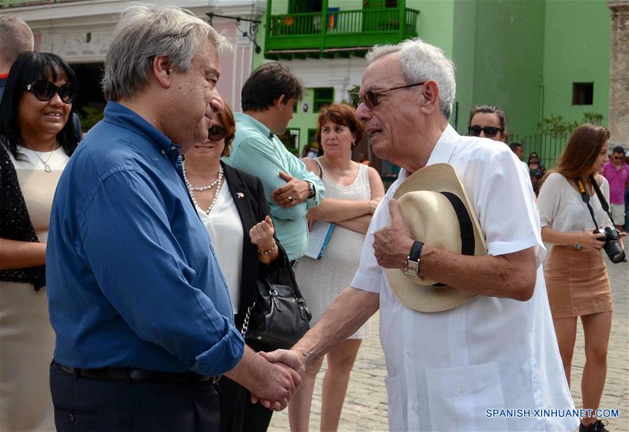 HABANA, mayo 7, 2018 (Xinhua) -- El secretario general de la Organización de las Naciones Unidas (ONU), António Guterres, saluda a una persona en el marco de su visita a La Habana, Cuba, el 7 de mayo de 2018. El secretario general de la Organización de las Naciones Unidas (ONU), António Guterres, llegó el lunes a Cuba en visita oficial, durante la cual asistirá a la apertura del 37 período de sesiones de la Comisión Económica para América Latina y el Caribe (CEPAL), que se realizará ma?ana martes en La Habana. (Xinhua/Joaquín Hernández)