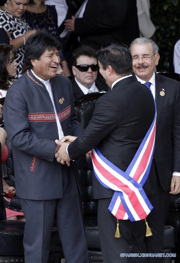 El presidente de Costa Rica, Carlos Alvarado (d-frente), estrecha la mano con el presidente de Bolivia, Evo Morales (i-frente), en presencia del presidente de República Dominicana, Danilo Medina (d-atrás), durante su ceremonia de juramentación, en la Plaza de la Democracia, en San José, capital de Costa Rica, el 8 de mayo de 2018. Carlos Alvarado Quesada, de 38 a?os, fue juramentado el martes como el nuevo presidente de Costa Rica para el periodo de gobierno 2018-2022, en un acto celebrado en la Plaza de la Democracia en la ciudad de San José. Alvarado, quien resultó vencedor en la segunda ronda electoral realizada el 1 de abril pasado en Costa Rica, recibió la banda presidencial que hasta hoy sostuvo Luis Guillermo Solís y que le fue colocada por la presidenta de la Asamblea Legislativa, Carolina Hidalgo. (Xinhua/Kent Gilbert)