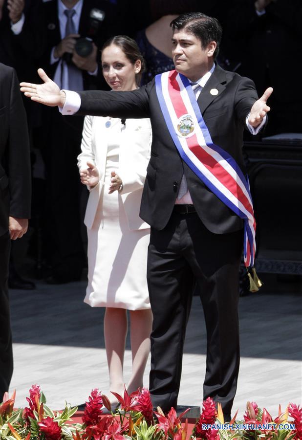 El presidente de Costa Rica, Carlos Alvarado (d), acompa?ado por la presidenta de la Asamblea Legislativa, Carolina Hidalgo (i), gesticula durante su ceremonia de juramentación, en la Plaza de la Democracia, en San José, capital de Costa Rica, el 8 de mayo de 2018. Carlos Alvarado Quesada, de 38 a?os, fue juramentado el martes como el nuevo presidente de Costa Rica para el periodo de gobierno 2018-2022, en un acto celebrado en la Plaza de la Democracia en la ciudad de San José. Alvarado, quien resultó vencedor en la segunda ronda electoral realizada el 1 de abril pasado en Costa Rica, recibió la banda presidencial que hasta hoy sostuvo Luis Guillermo Solís y que le fue colocada por la presidenta de la Asamblea Legislativa, Carolina Hidalgo. (Xinhua/Kent Gilbert)