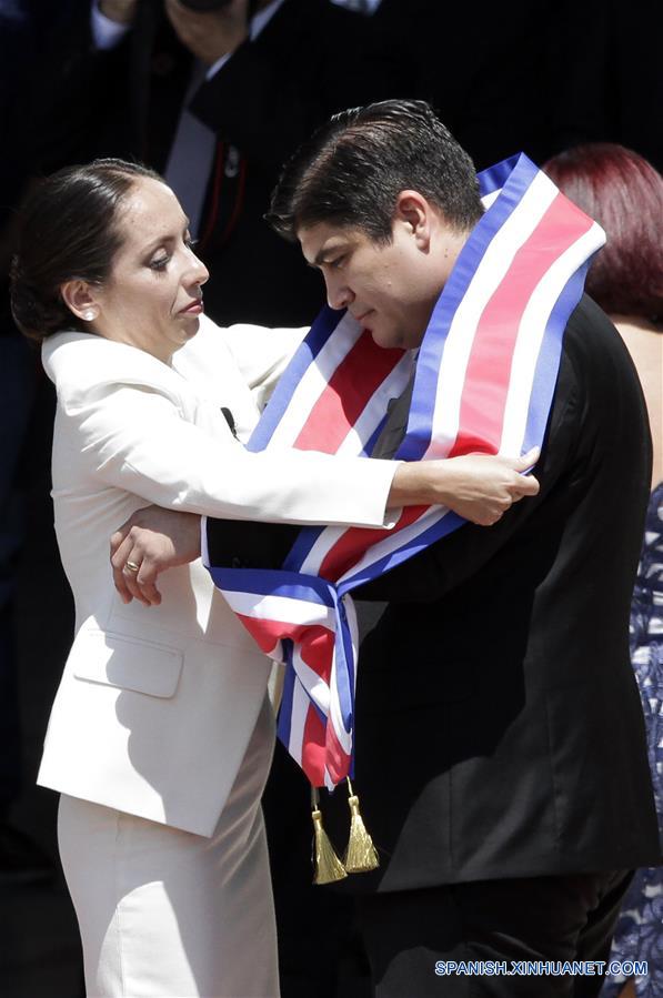 La presidenta de la Asamblea Legislativa, Carolina Hidalgo (i), coloca la banda presidencial a Carlos Alvarado (d), durante su ceremonia de juramentación, en la Plaza de la Democracia, en San José, capital de Costa Rica, el 8 de mayo de 2018. Carlos Alvarado Quesada, de 38 a?os, fue juramentado el martes como el nuevo presidente de Costa Rica para el periodo de gobierno 2018-2022, en un acto celebrado en la Plaza de la Democracia en la ciudad de San José. Alvarado, quien resultó vencedor en la segunda ronda electoral realizada el 1 de abril pasado en Costa Rica, recibió la banda presidencial que hasta hoy sostuvo Luis Guillermo Solís y que le fue colocada por la presidenta de la Asamblea Legislativa, Carolina Hidalgo.