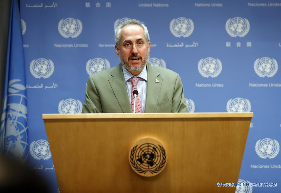 El vocero del secretario general de la Organización de las Naciones Unidas (ONU), Stephane Dujarric, lee una declaración del secretario general de la ONU, António Guterres, con respecto a la retirada de Estados Unidos del acuerdo nuclear iraní, en la sede de la ONU, en Nueva York, Estados Unidos, el 8 de mayo de 2018. El secretario general de la ONU, António Guterres, expresó el martes su "profunda preocupación" por la decisión del presidente de Estados Unidos, Donald Trump, de retirarse del acuerdo nuclear iraní de 2015. (Xinhua/Li Muzi)