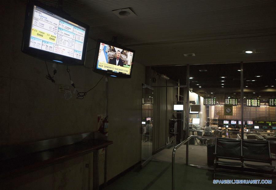 Una pantalla retransmite el mensaje grabado del presidente argentino Mauricio Macri, en la Bolsa de Comercio de Buenos Aires, en Buenos Aires, Argentina, el 8 de mayo de 2018. El presidente argentino, Mauricio Macri, anunció el martes que iniciará conversaciones con el Fondo Monetario Internacional (FMI) para conseguir "una línea de apoyo financiero", en medio de la devaluación del peso frente al dólar que se registra desde la semana pasada. La Bolsa de Comercio de Buenos Aires registró el martes una leve recuperación tras este anuncio. (Xinhua/Martín Zabala)