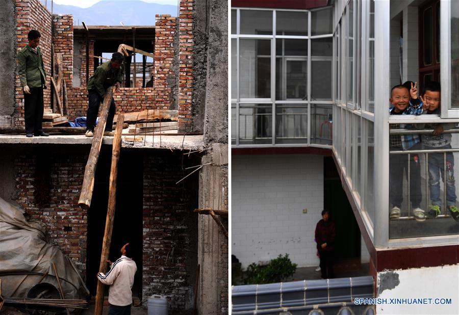 GANSU, mayo 10, 2018 (Xinhua) -- Imagen combinada de residentes trabajando en el sitio de construcción de una nueva vivienda el 21 de noviembre de 2008 (i), y ni?os jugando en casa el 9 de mayo de 2018 (d), en la villa de Gan'en de la ciudad de Longnan, provincia de Gansu, en el noroeste de China. La villa de Gan'en es una nueva villa construida para reubicar a los residentes de la villa de Haoping, que resultó severamente da?ada por el terremoto de Wenchuan 8.0 grados de magnitud ocurrido en 2008 en la vecina provincia de Sichuan. La villa fue nombrada "Gan'en" a finales de 2008 para expresar gratitud por los esfuerzos de reconstrucción realizados. Después de diez a?os de arduo trabajo, la villa de Gan'en ha recuperado la vida. (Xinhua/Nie Jianjiang, Fan Peishen)