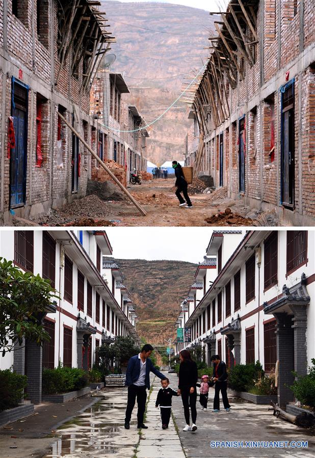 GANSU, mayo 10, 2018 (Xinhua) -- Imagen combinada de una residente trabajando en el sitio de construcción de viviendas nuevas el 21 de noviembre de 2008 (arriba), y residentes caminando en una calle el 9 de mayo de 2018 (abajo), en la villa de Gan'en de la ciudad de Longnan, provincia de Gansu, en el noroeste de China. La villa de Gan'en es una nueva villa construida para reubicar a los residentes de la villa de Haoping, que resultó severamente da?ada por el terremoto de Wenchuan 8.0 grados de magnitud ocurrido en 2008 en la vecina provincia de Sichuan. La villa fue nombrada "Gan'en" a finales de 2008 para expresar gratitud por los esfuerzos de reconstrucción realizados. Después de diez a?os de arduo trabajo, la villa de Gan'en ha recuperado la vida. (Xinhua/Nie Jianjiang, Fan Peishen)