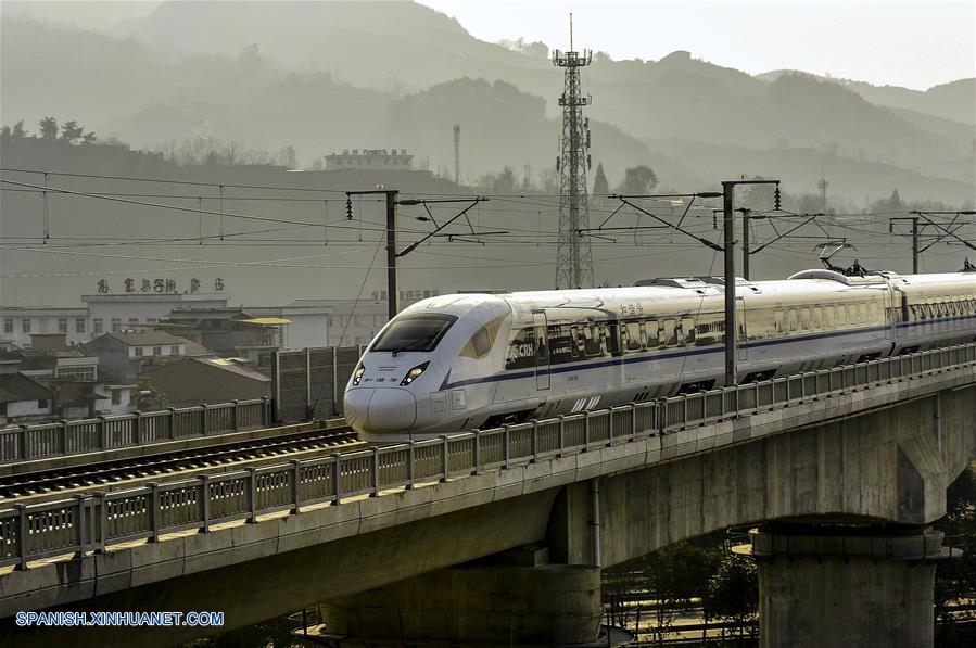 SHAANXI, abril 25, 2018 (Xinhua) -- Imagen del 30 de noviembre de 2017 de un tren bala pasando a través del municipio de Gaozhaizi en el condado de Ningqiang, provincia de Shaanxi, en el noroeste de China. El condado de Ningqiang fue afectado por un terremoto devastador que se centró en el condado de Wenchuan en la provincia de Sichuan, en el suroeste de China, el 12 de mayo de 2008. Luego de diez a?os de reconstrucción, las condiciones de vida han sido mejoradas y la economía ha repuntado fuertemente. Unos 113 sitios de reasentamiento fueron construidos y aproximadamente 23,000 familias se mudaron a viviendas nuevas. Unas 66 escuelas fueron reconstruidas y alrededor de 268 nuevas clínicas rurales fueron construidas. (Xinhua/Li Dehua)