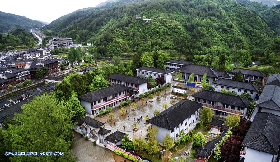 SHAANXI, abril 25, 2018 (Xinhua) -- Imagen del 24 de abril de 2018 de una vista aérea de la reconstruida Escuela Secundaria Furen del municipio de Qingmuchuan, en el condado de Ningqiang, provincia de Shaanxi, en el noroeste de China. El condado de Ningqiang fue afectado por un terremoto devastador que se centró en el condado de Wenchuan en la provincia de Sichuan, en el suroeste de China, el 12 de mayo de 2008. Luego de diez a?os de reconstrucción, las condiciones de vida han sido mejoradas y la economía ha repuntado fuertemente. Unos 113 sitios de reasentamiento fueron construidos y aproximadamente 23,000 familias se mudaron a viviendas nuevas. Unas 66 escuelas fueron reconstruidas y alrededor de 268 nuevas clínicas rurales fueron construidas. (Xinhua/Tao Ming)