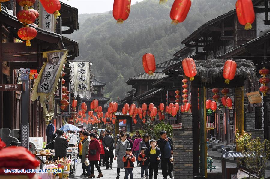 SHAANXI, abril 25, 2018 (Xinhua) -- Imagen del 5 de abril de 2018 de turistas caminando en la antigua localidad de Qingmuchuan, en el condado de Ningqiang, provincia de Shaanxi, en el noroeste de China. El condado de Ningqiang recibió a alrededor de 3.94 millones de visitantes y los ingresos del turismo alcanzaron 2.07 mil millones de yuanes (328 millones de dólares estadounidenses) en 2017. El condado de Ningqiang fue afectado por un terremoto devastador que se centró en el condado de Wenchuan en la provincia de Sichuan, en el suroeste de China, el 12 de mayo de 2008. Luego de diez a?os de reconstrucción, las condiciones de vida han sido mejoradas y la economía ha repuntado fuertemente. Unos 113 sitios de reasentamiento fueron construidos y aproximadamente 23,000 familias se mudaron a viviendas nuevas. Unas 66 escuelas fueron reconstruidas y alrededor de 268 nuevas clínicas rurales fueron construidas. (Xinhua/Tao Ming)