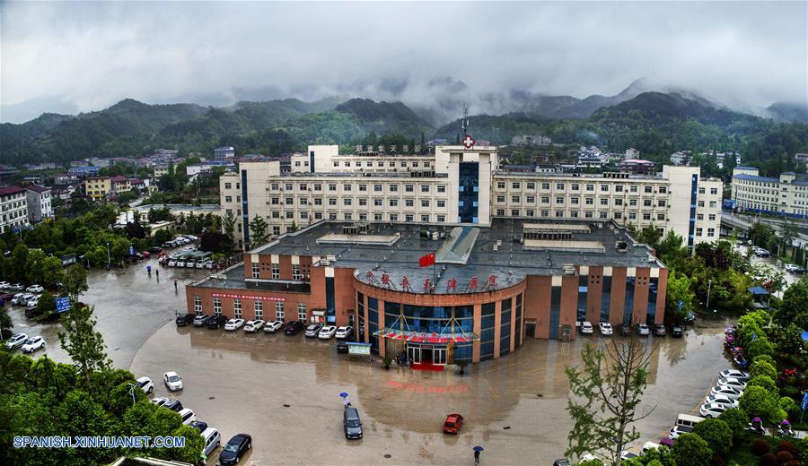 SHAANXI, abril 25, 2018 (Xinhua) -- Imagen del 24 de abril de 2018 de una vista aérea del Hospital Tianjin, en el condado de Ningqiang, provincia de Shaanxi, en el noroeste de China. El condado de Ningqiang fue afectado por un terremoto devastador que se centró en el condado de Wenchuan en la provincia de Sichuan, en el suroeste de China, el 12 de mayo de 2008. Luego de diez a?os de reconstrucción, las condiciones de vida han sido mejoradas y la economía ha repuntado fuertemente. Unos 113 sitios de reasentamiento fueron construidos y aproximadamente 23,000 familias se mudaron a viviendas nuevas. Unas 66 escuelas fueron reconstruidas y alrededor de 268 nuevas clínicas rurales fueron construidas. (Xinhua/Tao Ming)