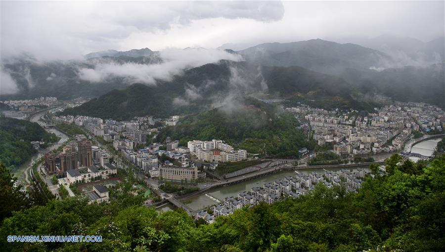 SICHUAN, abril 27, 2018 (Xinhua) -- Imagen del 25 de abril de 2018 de una vista aérea del condado de Qingchuan, provincia de Sichuan, en el suroeste de China. El condado de Qingchuan, que se vio gravemente afectado por un terremoto catastrófico el 12 de mayo de 2008, ahora tiene una apariencia nueva después de la reconstrucción. (Xinhua/Tao Ming)