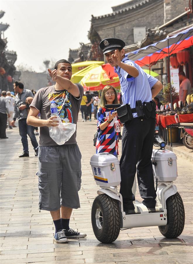 Un policía ayuda a un turista mientras patrulla en segway una calle en la antigua ciudad de Pingyao, un popular destino turístico, en Jinzhong, provincia de Shanxi, norte de China, el 13 de mayo de 2018. (Xinhua / Liang Shengren)