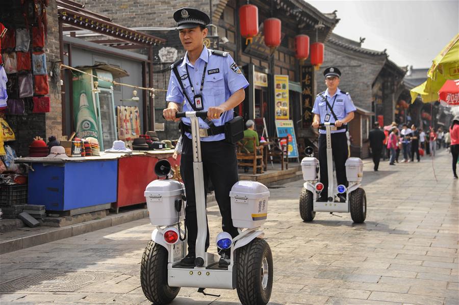 Pingyao, Shanxi, 14/05/2018(El Pueblo en Línea) - Dos policías montan en segway mientras patrullan una calle en la antigua ciudad de Pingyao, un popular destino turístico, en Jinzhong, provincia de Shanxi, norte de China, el 13 de mayo de 2018. (Xinhua / Liang Shengren)
