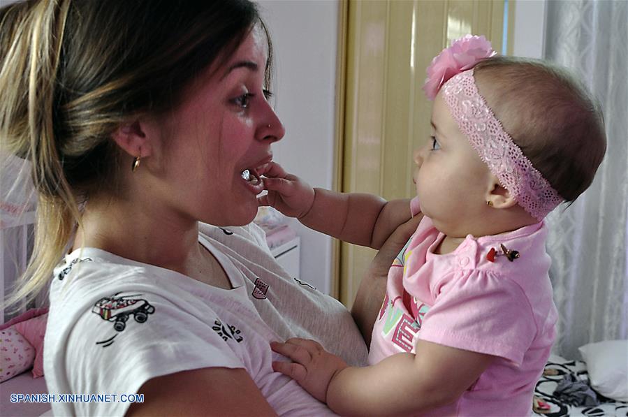 Imagen del 7 de mayo de 2018 de una mujer cargando a su hija en su casa, en el municipio Plaza de la Revolución, en La Habana, Cuba. (Xinhua/Str)
