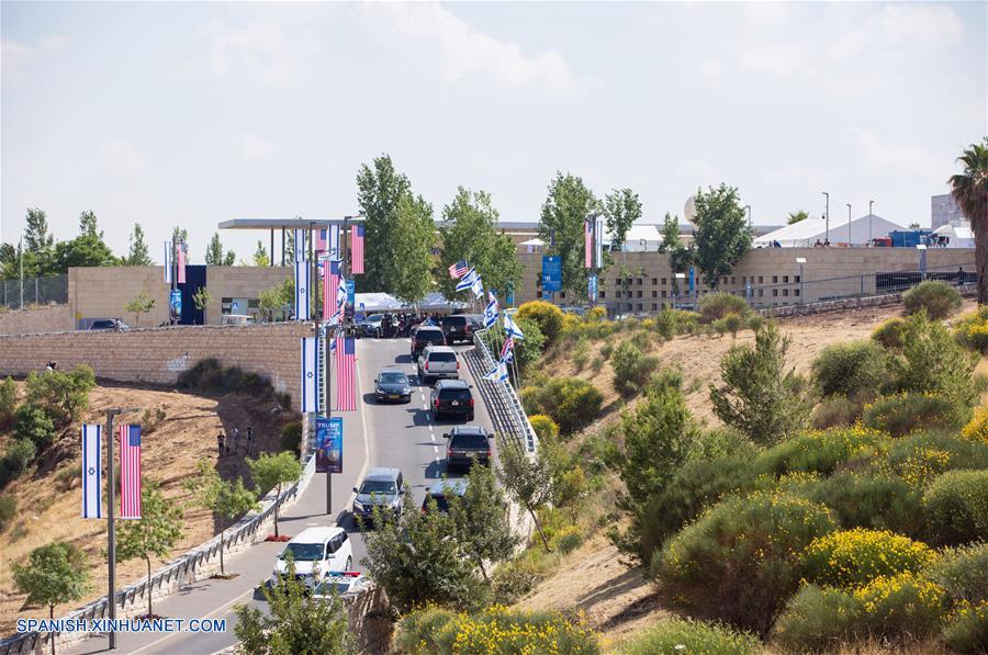 JERUSALEN, mayo 14, 2018 (Xinhua) -- Personas asisten a la ceremonia de inauguración de la nueva embajada estadounidense en Jerusalén, el 14 de mayo de 2018. De acuerdo con información de la prensa local, la ceremonia de inauguración de la nueva embajada estadounidense en Jerusalén comenzó el lunes por la tarde, y los israelíes y funcionarios estadounidenses se reunieron en la ciudad mientras ocurrían fuertes enfrentamientos en la Franja de Gaza. (Xinhua/Guo Yu)