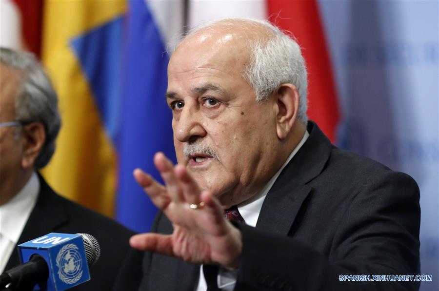 El observador permanente de Palestina en la Organización de las Naciones Unidas (ONU), Riyad Mansour, participa en un encuentro de representantes de los medios de comunicación en la sede de la ONU, en Nueva York, Estados Unidos, el 14 de mayo de 2018. El Consejo de Seguridad de la Organización de las Naciones Unidas tendrá una reunión de emergencia para abordar los violentos enfrentamientos entre manifestantes palestinos y fuerzas israelíes a lo largo de la frontera de la Franja de Gaza con Israel, dijo el lunes un enviado palestino. En declaraciones ante reporteros en la sede de la ONU en Nueva York, Riyad Mansour, observador permanente del Estado de Palestina en la ONU, dijo que la reunión tendrá lugar "posiblemente dentro de las próximas 24 horas".(Xinhua/Li Muzi)