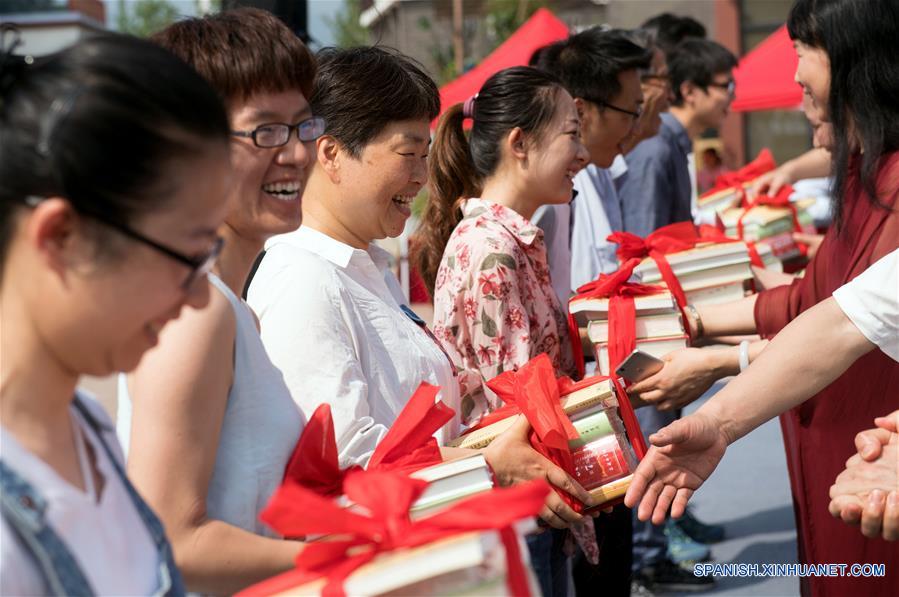 Amantes de la lectura reciben libros como regalo durante la ceremonia de inauguración de la temporada de lectura, en el condado de Tiantai, provincia de Zhejiang, en el este de China, el 15 de mayo de 2018. (Xinhua/Weng Xinyang)