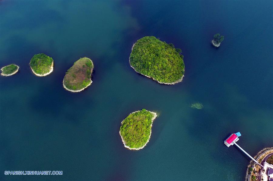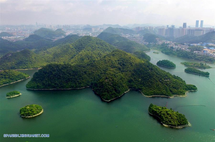 GUIZHOU, mayo 17, 2018 (Xinhua) -- Vista aérea del paisaje de parque de humedales de Aha en la provincia de Guizhou, en el suroeste de China, el 17 de mayo de 2018. (Xinhua/Qin Gang)