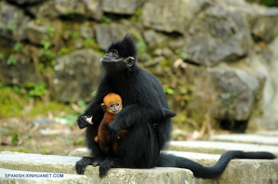 GUIZHOU, mayo 17, 2018 (Xinhua) -- Un langur de Francois, una especie de primate en peligro, sostiene a su bebé en la Reserva Natural Nacional Río Mayang, en el Distrito Autónomo Tujia de Yanhe, provincia de Guizhou, en el suroeste de China, el 17 de mayo de 2018. Más de 500 langures de Francois viven en la reserva natural y seis bebés de langur nacieron recientemente. (Xinhua/Yang Wenbin)