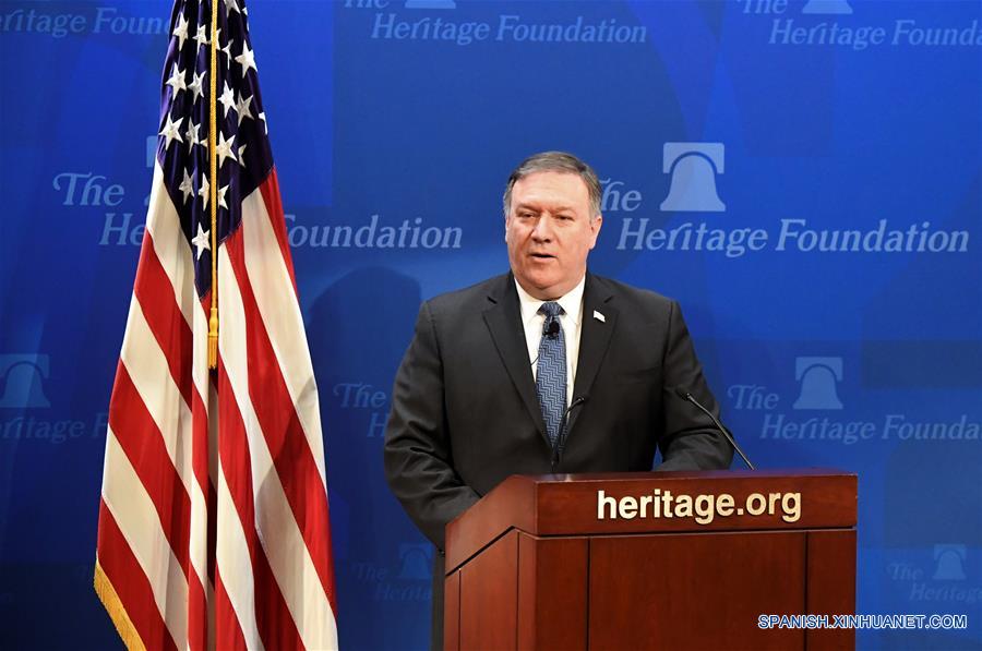 El secretario de Estado estadounidense, Mike Pompeo, pronuncia un discurso sobre la política estadounidense después de retirarse del acuerdo nuclear de Irán, en la Fundación Heritage, en Washington D.C., Estados Unidos, el 21 de mayo de 2018. El secretario de Estado de Estados Unidos, Mike Pompeo, dijo el lunes en Washington que Irán sufrirá las sanciones más duras de la historia de parte de Estados Unidos si no cambia el curso actual. En un discurso pronunciado en la Fundación Heritage de Estados Unidos, un grupo de consultoría conservador, para presentar una nueva estrategia de Estados Unidos sobre Irán, Pompeo urgió a Teherán a que reporte al Organismo Internacional de Energía Atómica sobre su programa nuclear, ponga fin a la proliferación de sus misiles y deje de apoyar a "grupos terroristas" en el Medio Oriente. (Xinhua/Yang Chenglin)