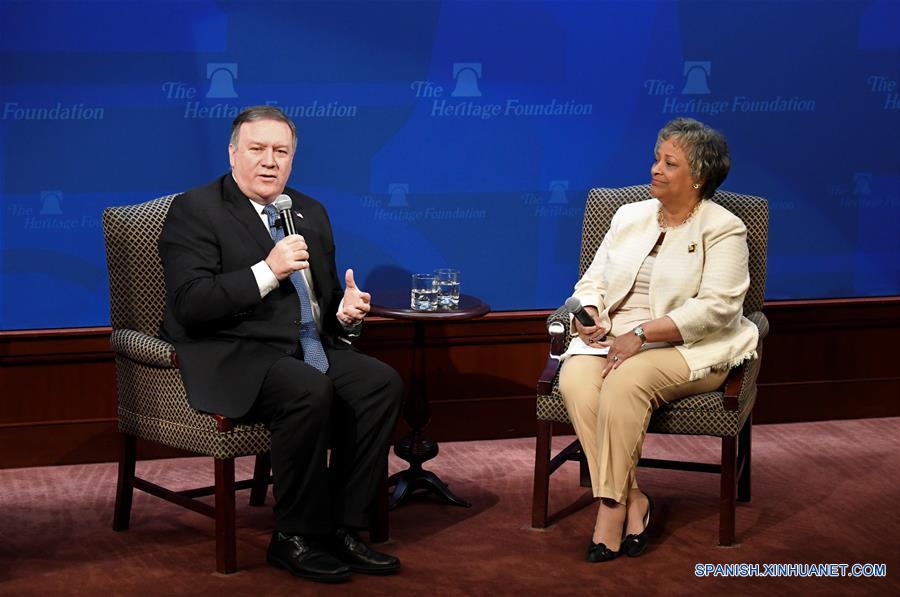 El secretario de Estado estadounidense, Mike Pompeo (i), discute la política estadounidense después de retirarse del acuerdo nuclear de Irán con la presidenta de la Fundación Heritage, Key Coles James (d), en Washington D.C., Estados Unidos, el 21 de mayo de 2018. El secretario de Estado de Estados Unidos, Mike Pompeo, dijo el lunes en Washington que Irán sufrirá las sanciones más duras de la historia de parte de Estados Unidos si no cambia el curso actual. En un discurso pronunciado en la Fundación Heritage de Estados Unidos, un grupo de consultoría conservador, para presentar una nueva estrategia de Estados Unidos sobre Irán, Pompeo urgió a Teherán a que reporte al Organismo Internacional de Energía Atómica sobre su programa nuclear, ponga fin a la proliferación de sus misiles y deje de apoyar a "grupos terroristas" en el Medio Oriente. (Xinhua/Yang Chenglin)