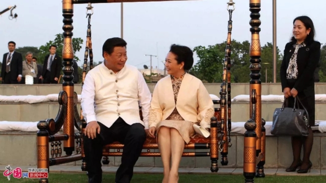 Xi Jinping y Peng Liyuan se sientan juntos en un columpio durante su visita a Gujarat, India, en septiembre de 2014. [Foto de archivo / china.org.cn]