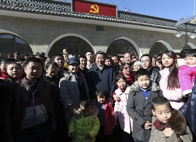 Xi Jinping y Peng Liyuan se hacen fotos con residentes locales en la aldea Liangjiahe, provincia de Shaanxi, el 13 de febrero de 2015. [Foto / Xinhua]