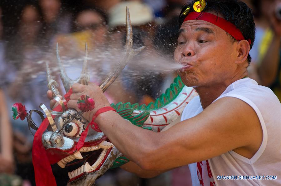 MACAO, mayo 22, 2018 (Xinhua) -- Un hombre realiza una danza del dragón borracho, durante un Festival del Dragón Borracho para celebrar el cumplea?os de Buda, en Macao, en el sur de China, el 22 de mayo de 2018. Reconocido como un artículo del patrimonio nacional cultural intangible de China, el Festival del Dragón Borracho se origina de una leyenda de Macao de un monje budista y un dragón divino que salvaron a la gente de la plaga durante la dinastía Qing (1644-1911). (Xinhua/Cheong Kam Ka)