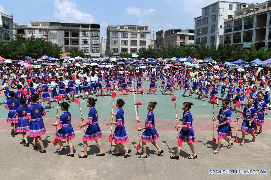 Estudiantes participan durante una celebración del Festival Weifeng, en el municipio de Luwei del condado de Binyang, en la Región Autónoma Zhuang de Guangxi, en el sur de China, el 22 de mayo de 2018. Las personas del grupo étnico Zhuang celebran el festival en el octavo día del cuarto mes en el calendario lunar chino. (Xinhua/Lu Bo'an)