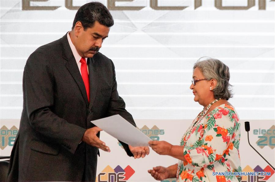 El presidente de Venezuela, Nicolás Maduro (i), recibe el acta que lo declara como ganador de las elecciones presidenciales de manos de la presidenta del Consejo Nacional Electoral (CNE), Tibisay Lucena (d), durante el acto en el que es proclamado como presidente para el periodo 2019-2025, en la sede del CNE, en Caracas, Venezuela, el 22 de mayo de 2018. (Xinhua/Boris Vergara)