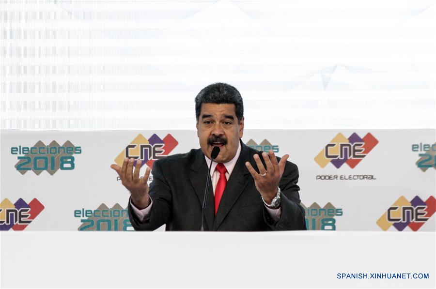 El presidente de Venezuela, Nicolás Maduro, pronuncia un discurso durante el acto en el que es proclamado como presidente para el periodo 2019-2025 en la sede del Consejo Nacional Electoral (CNE), en Caracas, Venezuela, el 22 de mayo de 2018. (Xinhua/Boris Vergara)