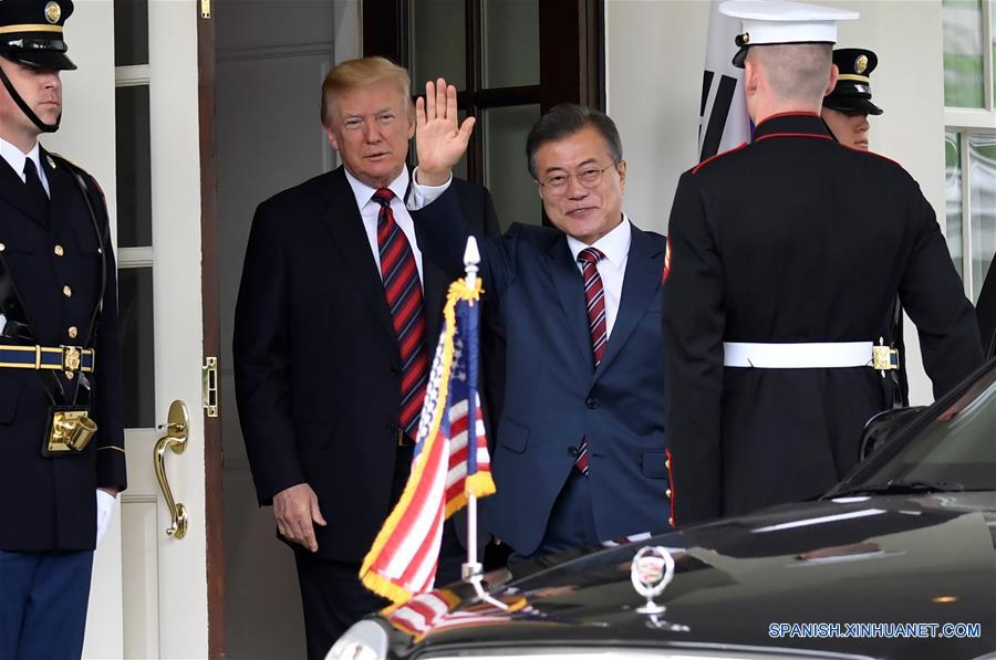 El presidente estadounidense, Donald Trump (2-i), recibe al presidente de República de Corea, Moon Jae-in (2-d-frente), en la Casa Blanca, en Washington D.C., Estados Unidos, el 22 de mayo de 2018. (Xinhua/Yang Chenglin)