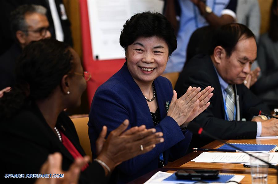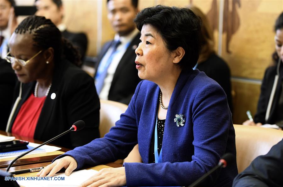 GINEBRA, mayo 22, 2018 (Xinhua) -- La viceministra de la Comisión Nacional de Salud de China, Cui Li (c), asiste al evento "Esfuerzos dirigidos por los países para eliminar la malaria y lograr la cobertura médica universal" realizado en el Palais des Nationes, en Ginebra, Suiza, el 22 de mayo de 2018. China está a punto de eliminar la malaria, indicó el martes una importante funcionaria china de salud en una reunión al margen de la Asamblea Mundial de Salud (AMS) en la que Beijing fue elogiado por sus esfuerzos para ayudar a otros países a combatir la enfermedad letal. (Xinhua/Alain Grosclaude)