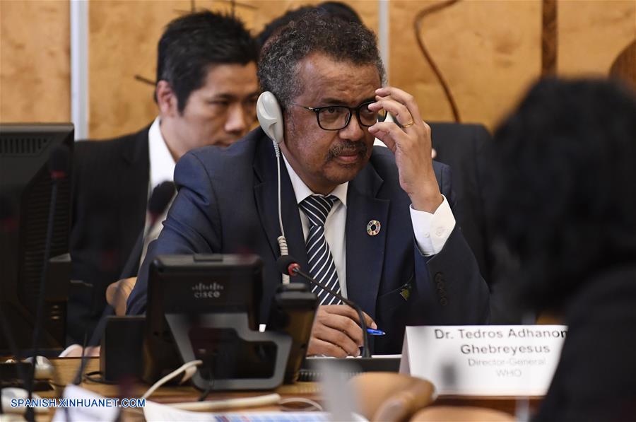 GINEBRA, mayo 22, 2018 (Xinhua) -- El director general de la Organización Mundial de Salud (OMS), Tedros Adhanom Ghebreyesus (c), asiste al evento "Esfuerzos dirigidos por los países para eliminar la malaria y lograr la cobertura médica universal" realizado en el Palais des Nationes, en Ginebra, Suiza, el 22 de mayo de 2018. China está a punto de eliminar la malaria, indicó el martes una importante funcionaria china de salud en una reunión al margen de la Asamblea Mundial de Salud (AMS) en la que Beijing fue elogiado por sus esfuerzos para ayudar a otros países a combatir la enfermedad letal. (Xinhua/Alain Grosclaude)