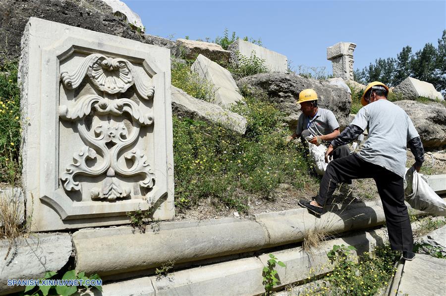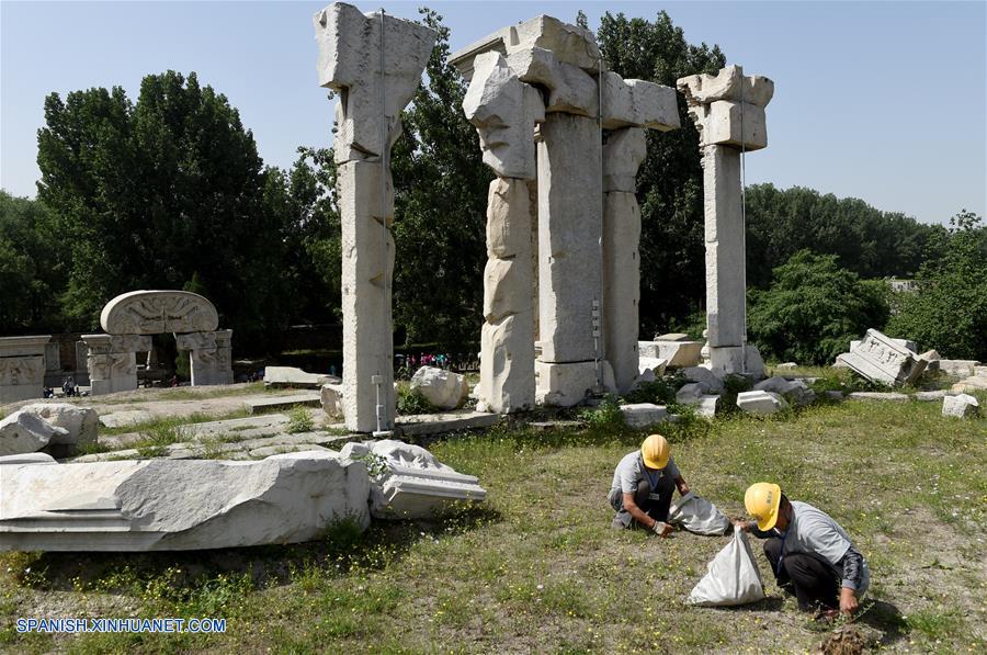 BEIJING, mayo 23, 2018 (Xinhua) -- Empleados limpian hierbas en las ruinas de Yuanying Guan (Inmenso Observatorio Oceánico) en Yuanmingyuan en Beijing, capital de China, el 23 de mayo de 2018. El proyecto de reforzamiento de cuatro meses de las ruinas del Inmenso Observatorio Oceánico en el sitio histórico de Yuanmingyuan comenzó recientemente. (Xinhua/Luo Xiaoguang)