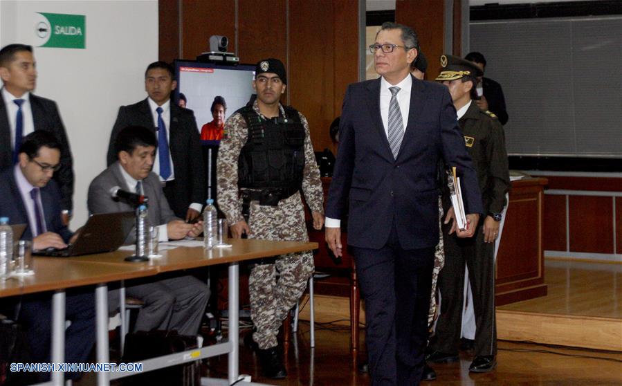 QUITO, mayo 23, 2018 (Xinhua) -- El ex vicepresidente Jorge Glas (frente) llega a su audiencia de apelación, en la sala de la Corte Nacional de Justicia, en Quito, capital de Ecuador, el 23 de mayo de 2018. El ex vicepresidente de Ecuador, Jorge Glas, insistió el miércoles en su inocencia dentro de la trama de sobornos de la constructora brasile?a Odebrecht, durante la celebración de la audiencia de apelación de la condena de seis a?os que se le impuso en diciembre pasado. (Xinhua/Str)