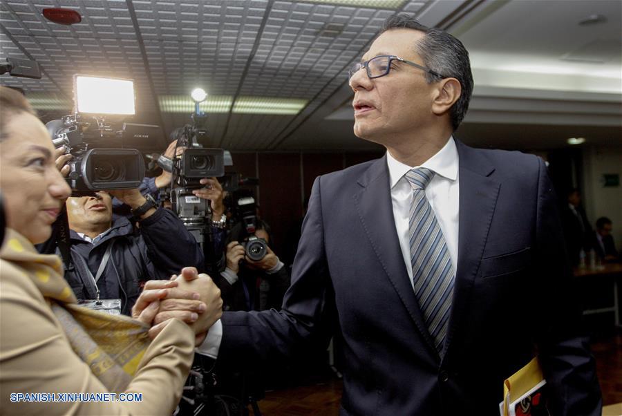 QUITO, mayo 23, 2018 (Xinhua) -- El ex vicepresidente Jorge Glas (d) saluda a los asistentes a su audiencia de apelación, en la sala de la Corte Nacional de Justicia, en Quito, capital de Ecuador, el 23 de mayo de 2018. El ex vicepresidente de Ecuador, Jorge Glas, insistió el miércoles en su inocencia dentro de la trama de sobornos de la constructora brasile?a Odebrecht, durante la celebración de la audiencia de apelación de la condena de seis a?os que se le impuso en diciembre pasado. (Xinhua/Str)