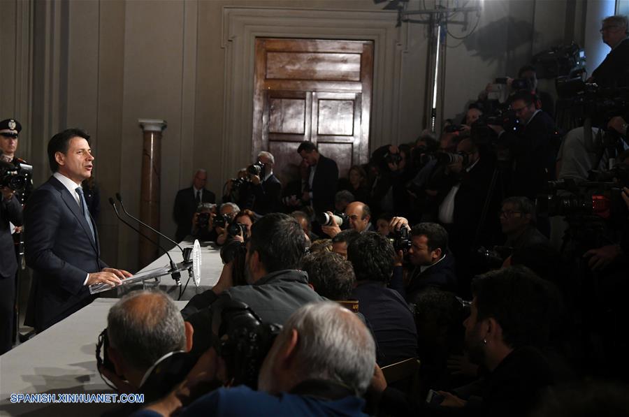 ROMA, mayo 23, 2018 (Xinhua) -- Giuseppe Conte (i) sostiene una conferencia de prensa después de reunirse con el presidente de Italia, Sergio Mattarella, en Roma, Italia, el 23 de mayo de 2018. El presidente de Italia, Sergio Mattarella, nombró el miércoles al profesor de derecho Giuseppe Conte como nuevo primer ministro italiano y le dio el mandato de formar un nuevo gobierno. Conte fue propuesto esta semana por la Liga de derecha y el populista Movimiento Cinco Estrellas, los dos partidos que recibieron más votos en las poco concluyentes elecciones del 4 de marzo. (Xinhua/Alberto Lingria)