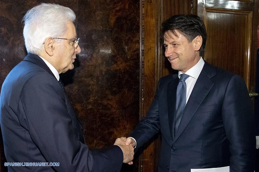 ROMA, mayo 23, 2018 (Xinhua) -- El presidente de Italia, Sergio Mattarella (i), estrecha la mano de Giuseppe Conte (d), el recién nombrado primer ministro de Italia, durante una reunión en Roma, Italia, el 23 de mayo de 2018. El presidente de Italia, Sergio Mattarella, nombró el miércoles al profesor de derecho Giuseppe Conte como nuevo primer ministro italiano y le dio el mandato de formar un nuevo gobierno. Conte fue propuesto esta semana por la Liga de derecha y el populista Movimiento Cinco Estrellas, los dos partidos que recibieron más votos en las poco concluyentes elecciones del 4 de marzo. (Xinhua/Us/ROPI/ZUMAPRESS)