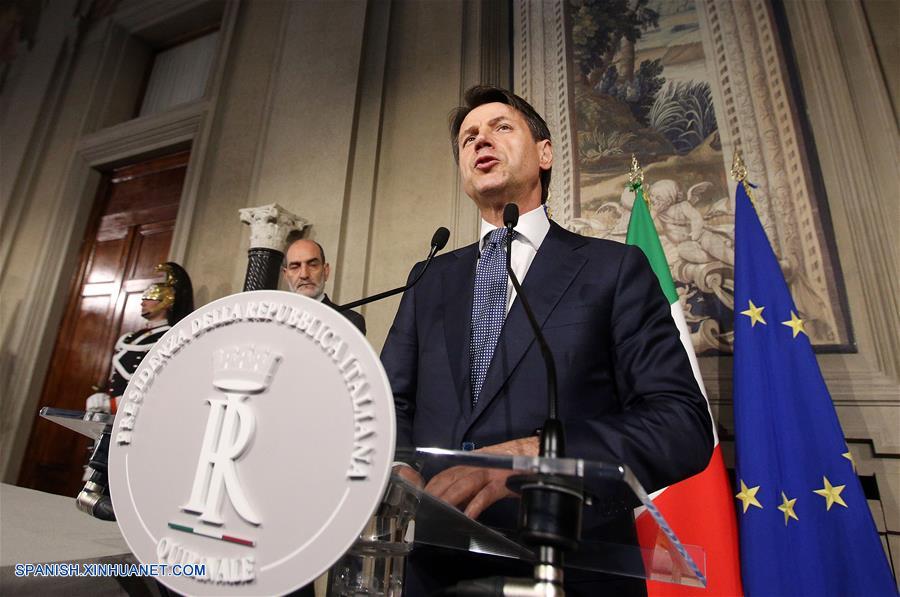 ROMA, mayo 23, 2018 (Xinhua) -- El recién nombrado primer ministro de Italia, Giuseppe Conte, pronuncia un discurso después de una reunión con el presidente italiano, Sergio Mattarella, en Roma, Italia, el 23 de mayo de 2018. El presidente de Italia, Sergio Mattarella, nombró el miércoles al profesor de derecho Giuseppe Conte como nuevo primer ministro italiano y le dio el mandato de formar un nuevo gobierno. Conte fue propuesto esta semana por la Liga de derecha y el populista Movimiento Cinco Estrellas, los dos partidos que recibieron más votos en las poco concluyentes elecciones del 4 de marzo. (Xinhua/Us/ROPI/ZUMAPRESS)
