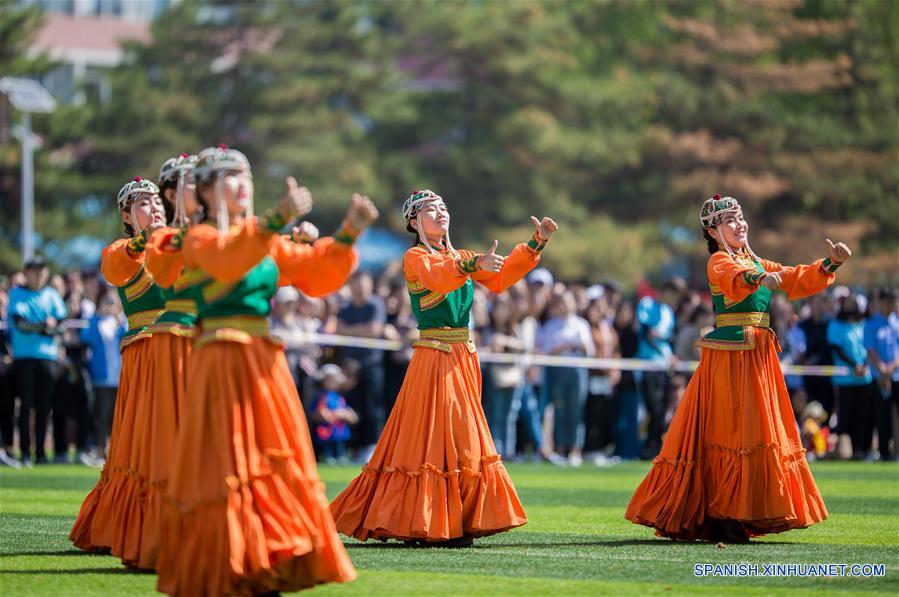 Estudiantes del Colegio Hohhot Minzu interpretan un baile en la Feria Nadam de la escuela, en Hohhot, en la Región Autónoma de Mongolia Interior, en el norte de China, el 23 de mayo de 2018. (Xinhua/Ding Genhou)