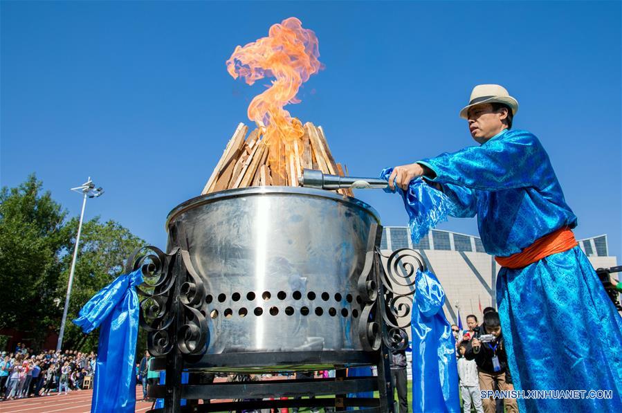 HOHHOT, mayo 23, 2018 (Xinhua) -- Un ritual es llevado a cabo durante la Feria Nadam del Colegio Hohhot Minzu, en Hohhot, en la Región Autónoma de Mongolia Interior, en el norte de China, el 23 de mayo de 2018. (Xinhua/Ding Genhou)