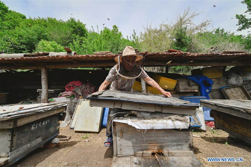Liu Zailong tapa una colmena ubicada en la aldea Dongtai, en Wangqing, provincia de Jilin, 22 de mayo del 2018. Este octogenario campesino labora como apicultor para aumentar sus ingresos personales. Su aldea se ha planteado desarrollar la apicultura para reducir la pobreza. (Foto: Xinhua/ Xu Chang)