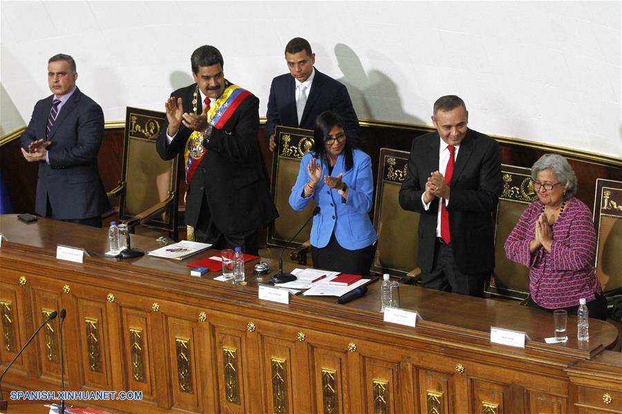 CARACAS, mayo 24, 2018 (Xinhua) -- El presidente venezolano, Nicolás Maduro (2-i), en presencia de la presidenta de la Asamblea Nacional Constituyente (ANC), Delcy Rodríguez (c-frente) y la presidenta del Consejo Nacional Electoral (CNE), Tibisay Lucena (d), reacciona durante su acto de juramentación ante la ANC, en el Palacio Federal Legislativo, en Caracas, Venezuela, el 24 de mayo de 2018. (Xinhua/Pedro Mattey/AVN)