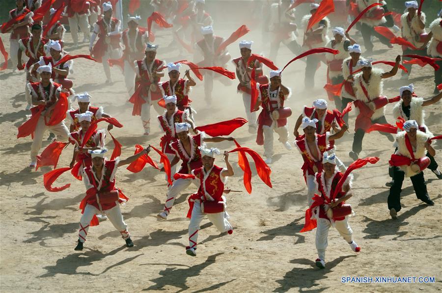 Imagen del 25 de mayo de 2018 de artistas realizando una actuación con tambores de cintura de Ansai, en un punto escénico en el distrito de Ansai de la ciudad de Yan'an, provincia de Shaanxi, en el noroeste de China. Más de 400 artistas participaron en el espectáculo de tambores de cintura llevado a cabo el viernes en Ansai, atrayendo a muchos visitantes. (Xinhua/Shao Rui)