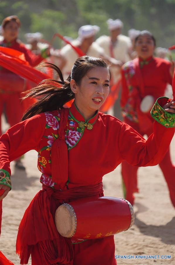 SHAANXI, mayo 26, 2018 (Xinhua) -- Imagen del 25 de mayo de 2018 de artistas realizando una actuación con tambores de cintura de Ansai, en un punto escénico en el distrito de Ansai de la ciudad de Yan'an, provincia de Shaanxi, en el noroeste de China. Más de 400 artistas participaron en el espectáculo de tambores de cintura llevado a cabo el viernes en Ansai, atrayendo a muchos visitantes. (Xinhua/Shao Rui)