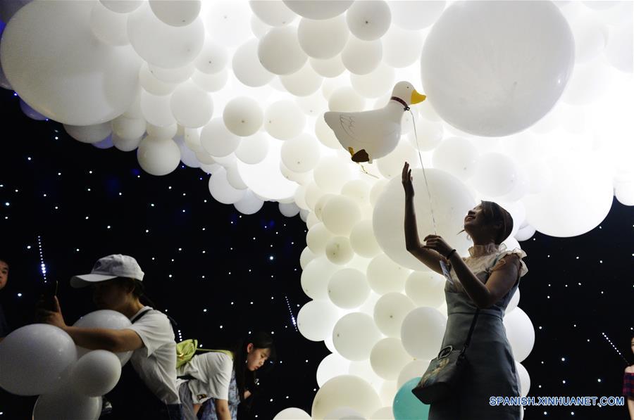 TIANJIN, mayo 26, 2018 (Xinhua) -- Imagen del 25 de mayo de 2018 de personas visitando una exposición de arte de globos, en Tianjin, en el norte de China. (Xinhua/Shi Songyu)